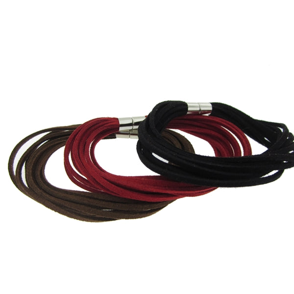 The multi-strap suede bracelet has a magnetic closure. and is 7.5 inches in length (unclasped).