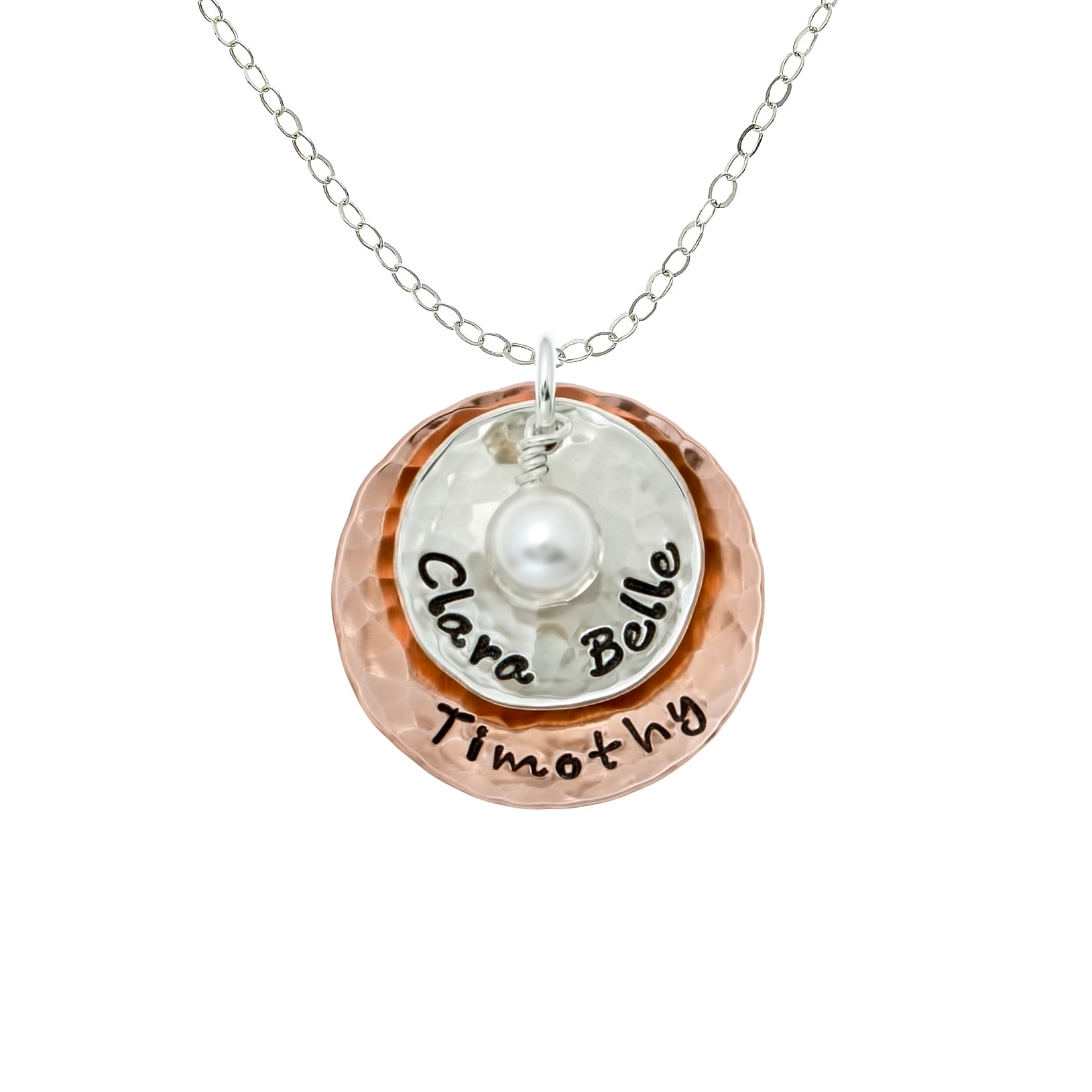 Sterling silver and Copper discs are carefully personalized with your choice of characters. The copper disc is rose gold plated with a hammered finish and domed (concave in) and hung on a sterling silver chain together with a Swarovski® pearl.