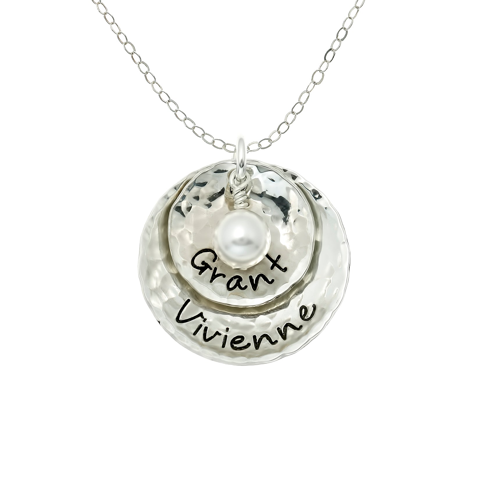 The sterling silver discs are personalized with your choice of name/words. The discs have a hammered finish and domed (concave in) and hung on a sterling silver chain with Swarovski® pearl.