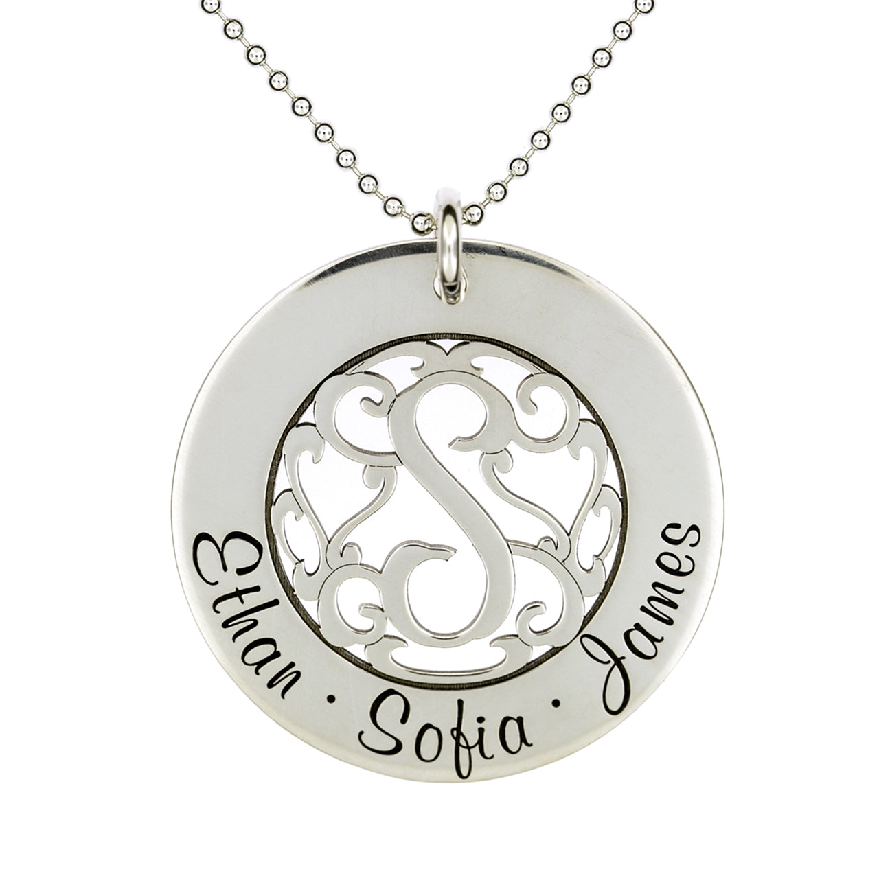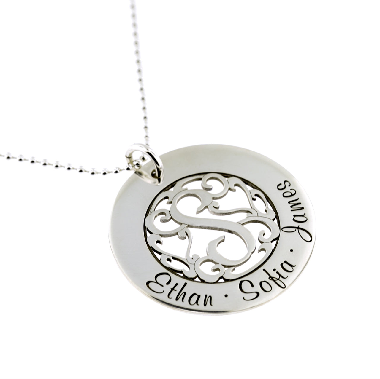 The 1 inch round sterling silver pendant with a single initial monogram in the center and names/characters around the edge, is a truly unique necklace. The monogram features a 5/8 inch diameter which can be the initial of your family name. The pendant is hand polished for a brilliant shiny look.